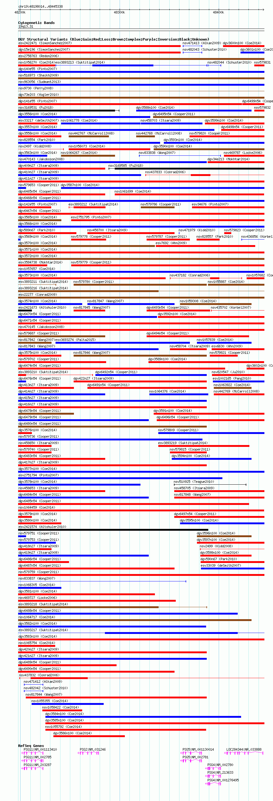 Variant DetailsVariant: nsv1066555| Internal ID | 19155774 | | Landmark | | | Location Information | | | Cytoband | 19q13.31 | | Allele length | | Assembly | Allele length | | hg38 | 247325 | | hg19 | 247325 | | hg18 | 247325 |