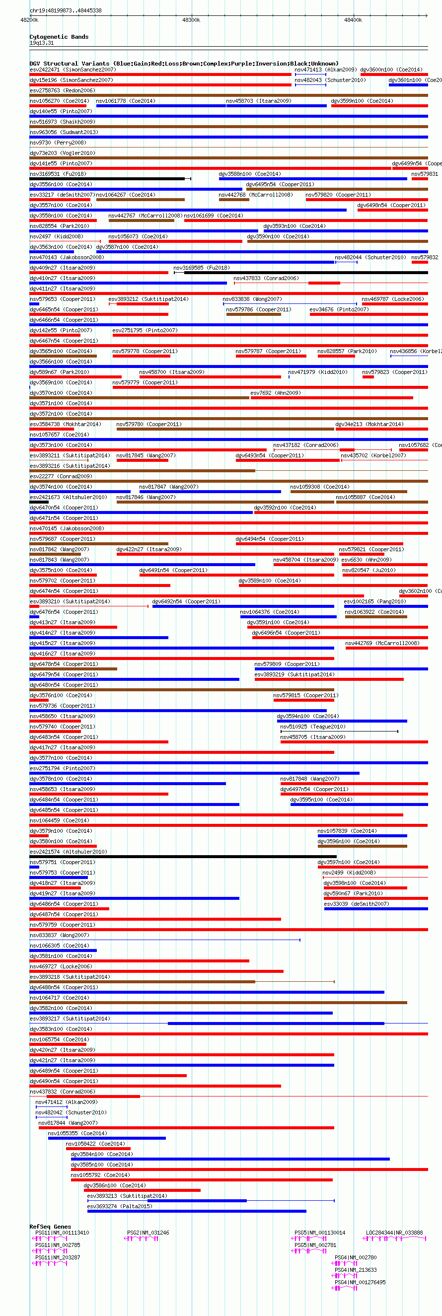 Variant DetailsVariant: nsv1066574| Internal ID | 19155793 | | Landmark | | | Location Information | | | Cytoband | 19q13.31 | | Allele length | | Assembly | Allele length | | hg38 | 245466 | | hg19 | 245466 | | hg18 | 245466 |