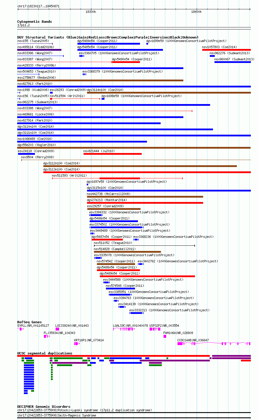 Variant DetailsVariant: nsv1066638| Internal ID | 18809169 | | Landmark | | | Location Information | | | Cytoband | 17p11.2 | | Allele length | | Assembly | Allele length | | hg38 | 220756 | | hg19 | 220755 | | hg18 | 220755 |
