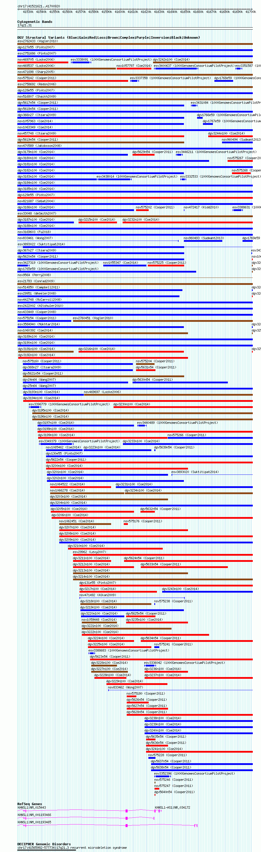| | Variant Type | CNV gain | | Copy Number | | | Allele State | | | Allele Origin | | | Probe Count | | | Validation Flag | | | Merged Status | M | | Merged Variants | dgv3181n100 | | Supporting Variants | nssv3720332, nssv3546409, nssv3720337, nssv3546402, nssv3720335, nssv3720336, nssv3546410, nssv3720334, nssv3546406, nssv3546408, nssv3546407, nssv3720328, nssv3720327, nssv3546405, nssv3546403, nssv3720331, nssv3720333, nssv3720326, nssv3720329, nssv3720330, nssv3546404 | | Samples | | | Known Genes | KANSL1, KANSL1-AS1, LOC644172 | | Method | SNP array | | Analysis | Affymetrix SNP array copy number analysis | | Platform | Affymetrix SNP Array 6.0 | | Comments | | | Reference | Coe_et_al_2014 | | Pubmed ID | 25217958 | | Accession Number(s) | nsv1066681