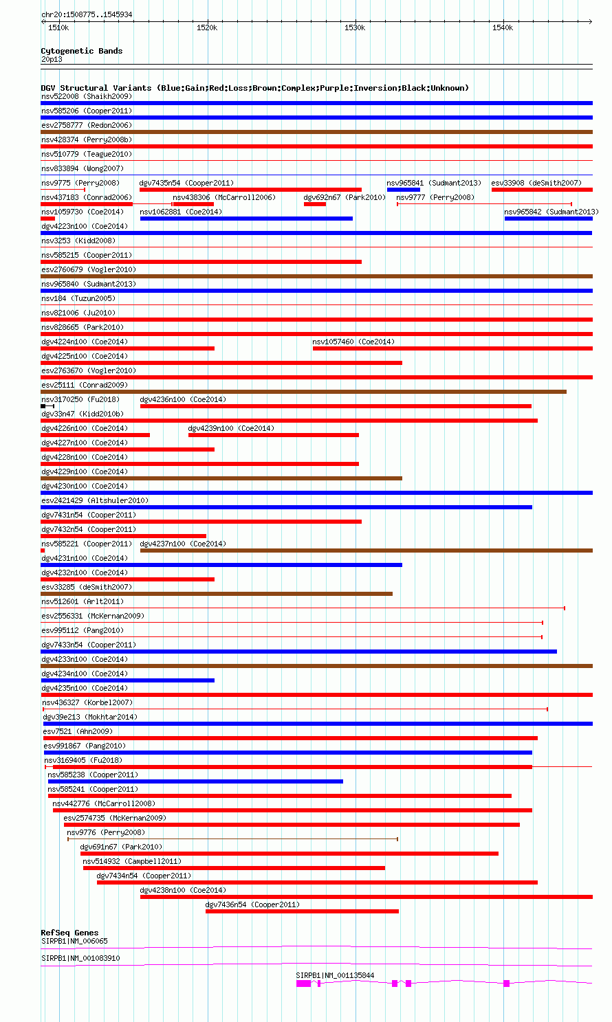 | | Variant Type | CNV gain+loss | | Copy Number | | | Allele State | | | Allele Origin | | | Probe Count | | | Validation Flag | | | Merged Status | M | | Merged Variants | dgv4233n100 | | Supporting Variants | nssv3594320, nssv3594317, nssv3728477, nssv3594318, nssv3594319, nssv3594316 | | Samples | | | Known Genes | SIRPB1 | | Method | SNP array | | Analysis | Affymetrix SNP array copy number analysis | | Platform | Affymetrix SNP Array 6.0 | | Comments | | | Reference | Coe_et_al_2014 | | Pubmed ID | 25217958 | | Accession Number(s) | nsv1066711
