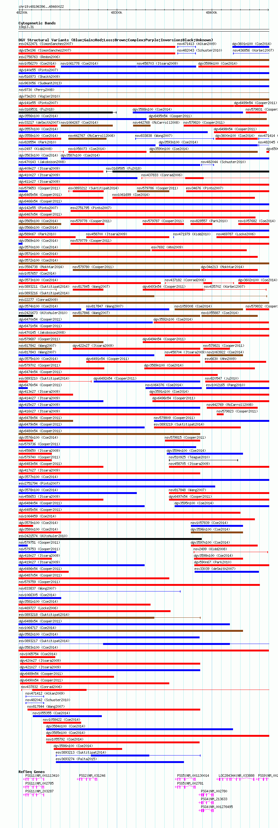 Variant DetailsVariant: nsv1066720| Internal ID | 19155939 | | Landmark | | | Location Information | | | Cytoband | 19q13.31 | | Allele length | | Assembly | Allele length | | hg38 | 263627 | | hg19 | 263627 | | hg18 | 263627 |