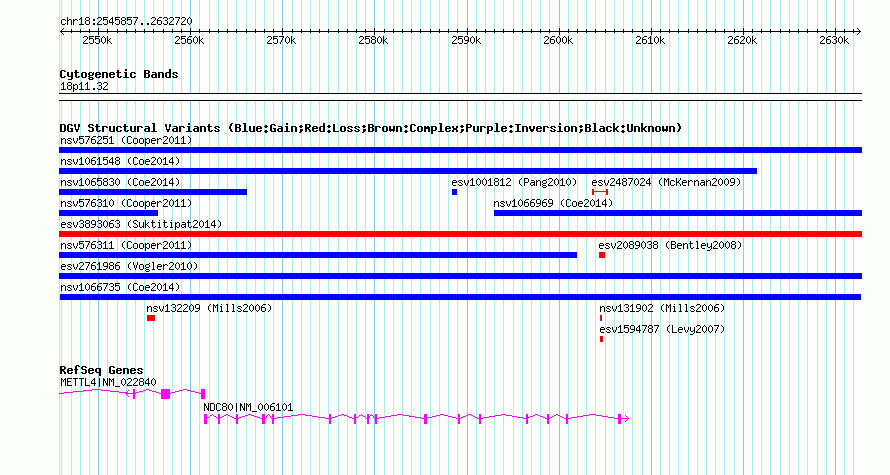 Variant DetailsVariant: nsv1066735| Internal ID | 19155954 | | Landmark | | | Location Information | | | Cytoband | 18p11.32 | | Allele length | | Assembly | Allele length | | hg38 | 86864 | | hg19 | 86864 | | hg18 | 86864 |