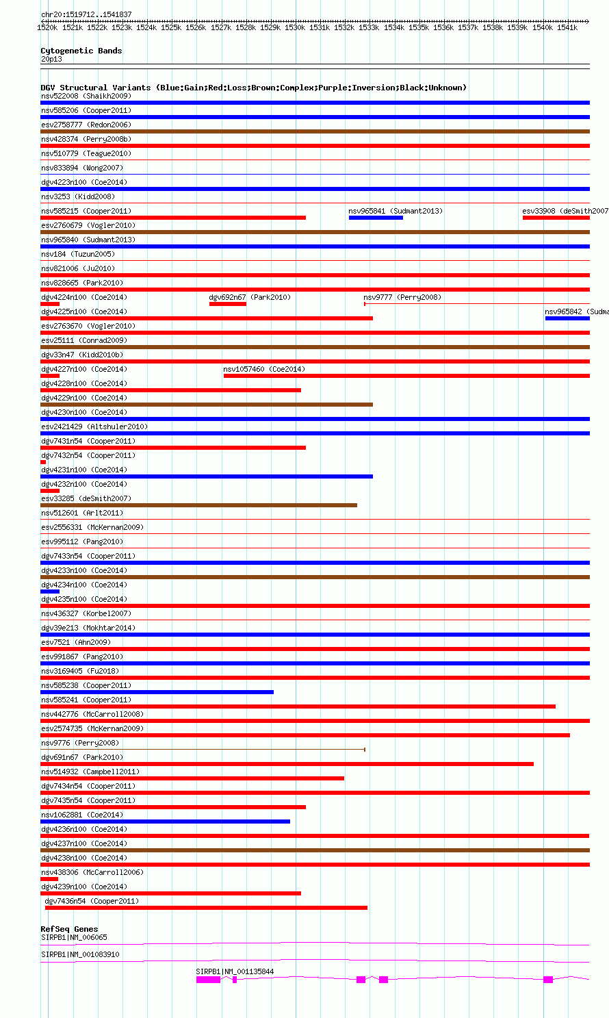 Variant DetailsVariant: nsv1066749| Internal ID | 19155968 | | Landmark | | | Location Information | | | Cytoband | 20p13 | | Allele length | | Assembly | Allele length | | hg38 | 22126 | | hg19 | 22126 | | hg18 | 22126 |