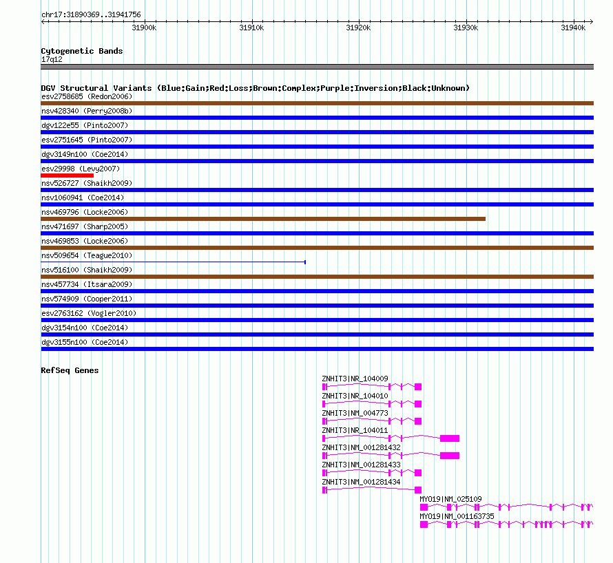 | Variant Type | CNV gain | Copy Number | | Allele State | | Allele Origin | | Probe Count | | Validation Flag | | Merged Status | M | Merged Variants | dgv3154n100 | Supporting Variants | nssv3562529 | Samples | | Known Genes | MYO19, ZNHIT3 | Method | SNP array | Analysis | Affymetrix SNP array copy number analysis | Platform | Affymetrix SNP Array 6.0 | Comments | | Reference | Coe_et_al_2014 | Pubmed ID | 25217958 | Accession Number(s) | nsv1066758