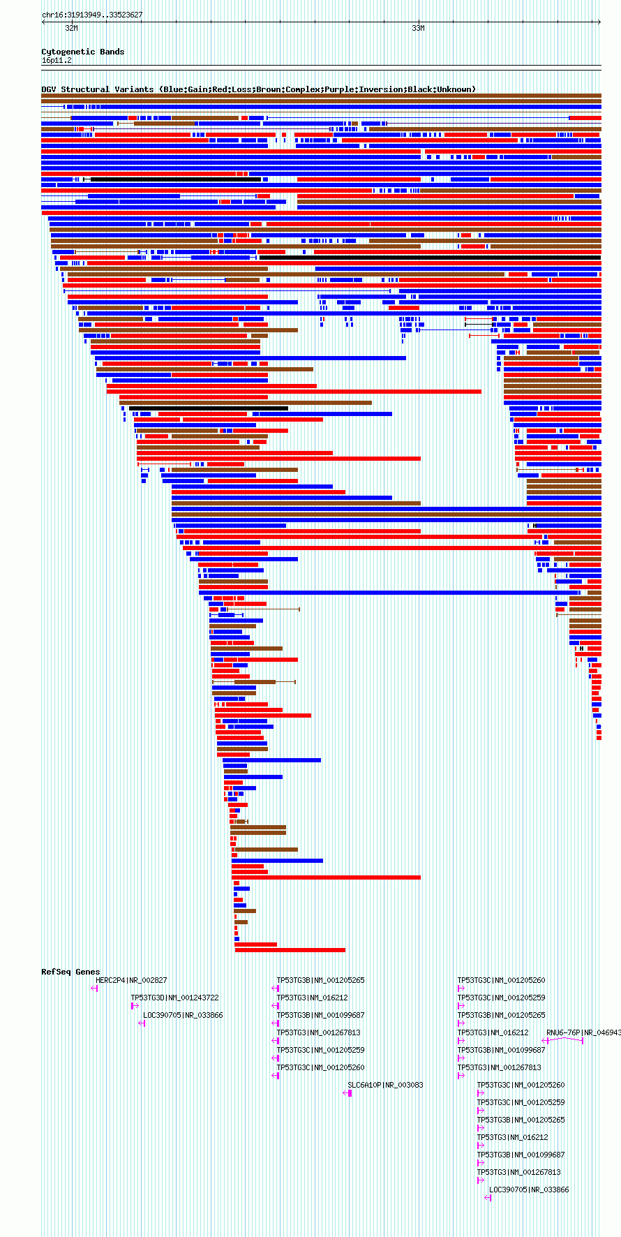 | | Variant Type | CNV loss | | Copy Number | | | Allele State | | | Allele Origin | | | Probe Count | | | Validation Flag | | | Merged Status | M | | Merged Variants | dgv2842n100 | | Supporting Variants | nssv3549188 | | Samples | | | Known Genes | HERC2P4, LOC390705, RNU6-76P, SLC6A10P, TP53TG3, TP53TG3B, TP53TG3C, TP53TG3D | | Method | SNP array | | Analysis | Affymetrix SNP array copy number analysis | | Platform | Affymetrix SNP Array 6.0 | | Comments | | | Reference | Coe_et_al_2014 | | Pubmed ID | 25217958 | | Accession Number(s) | nsv1066771