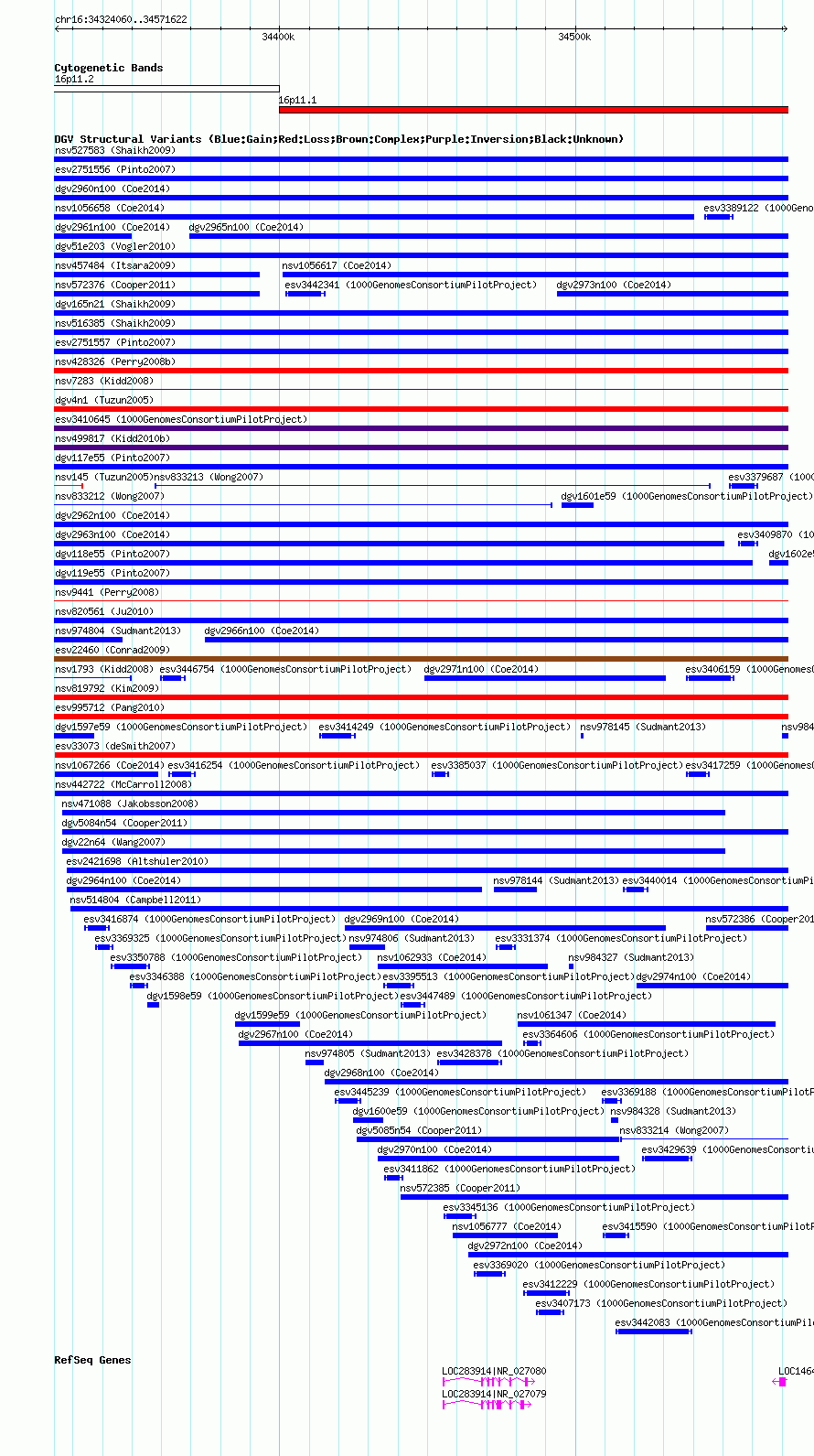 Variant DetailsVariant: nsv1066957| Internal ID | 19156176 | | Landmark | | | Location Information | | | Cytoband | 16p11.1 | | Allele length | | Assembly | Allele length | | hg38 | 247563 | | hg19 | 247563 | | hg18 | 247563 |