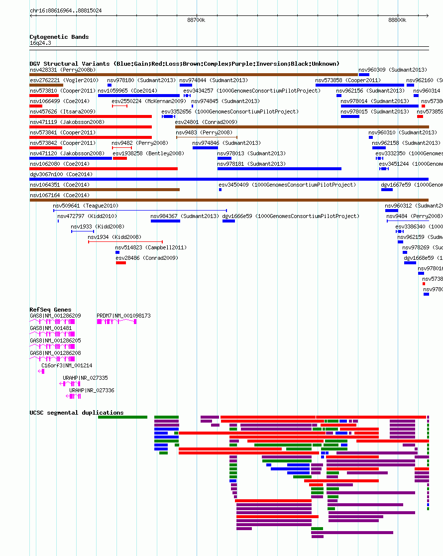 | | Variant Type | CNV gain+loss | | Copy Number | | | Allele State | | | Allele Origin | | | Probe Count | | | Validation Flag | | | Merged Status | M | | Merged Variants | | | Supporting Variants | nssv3560015, nssv3560014 | | Samples | | | Known Genes | C16orf3, GAS8, PRDM7, URAHP | | Method | SNP array | | Analysis | Affymetrix SNP array copy number analysis | | Platform | Affymetrix SNP Array 6.0 | | Comments | | | Reference | Coe_et_al_2014 | | Pubmed ID | 25217958 | | Accession Number(s) | nsv1067164