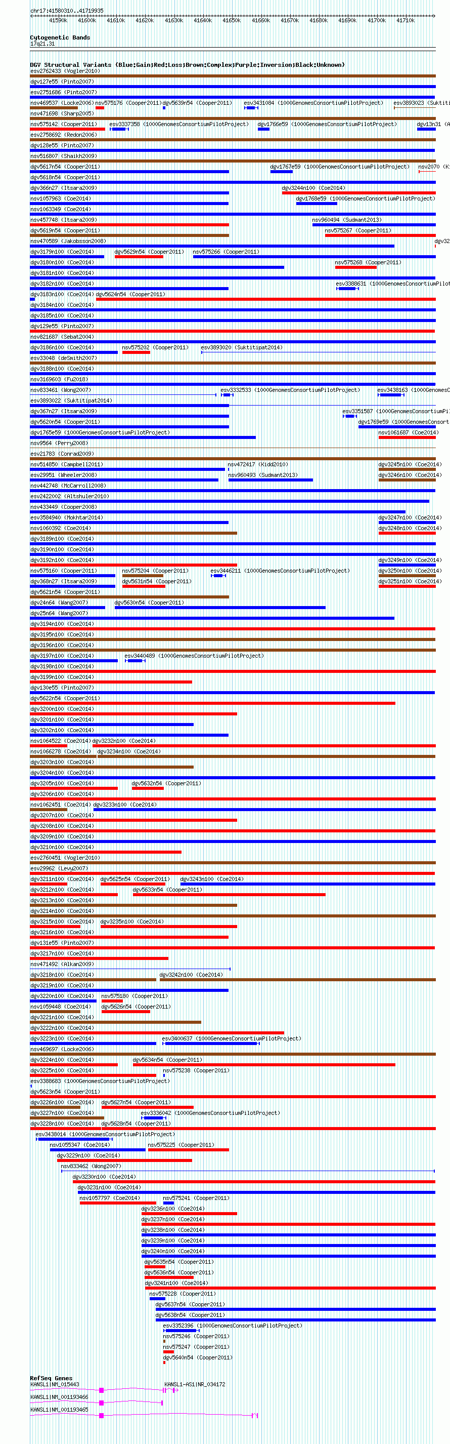 Variant DetailsVariant: nsv1067192| Internal ID | 19156411 | | Landmark | | | Location Information | | | Cytoband | 17q21.31 | | Allele length | | Assembly | Allele length | | hg38 | 139626 | | hg19 | 139626 | | hg18 | 139626 |