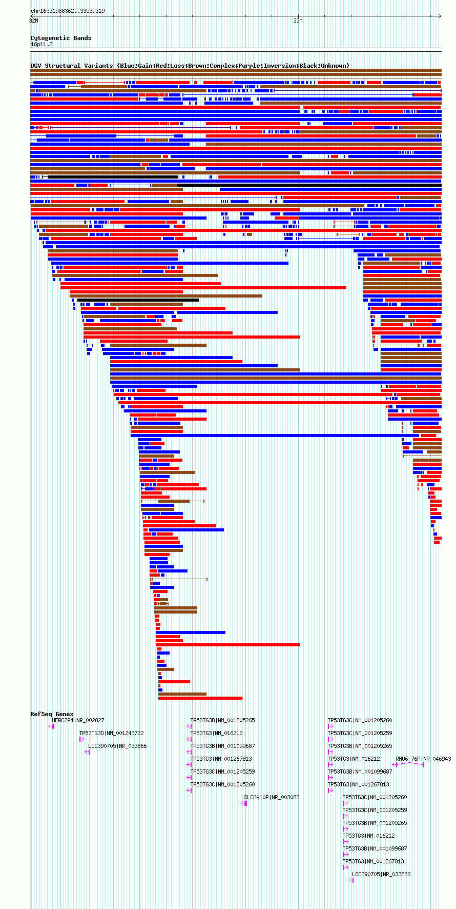 | | Variant Type | CNV gain+loss | | Copy Number | | | Allele State | | | Allele Origin | | | Probe Count | | | Validation Flag | | | Merged Status | M | | Merged Variants | dgv2844n100 | | Supporting Variants | nssv3716246, nssv3549359, nssv3549360, nssv3716245 | | Samples | | | Known Genes | HERC2P4, LOC390705, RNU6-76P, SLC6A10P, TP53TG3, TP53TG3B, TP53TG3C, TP53TG3D | | Method | SNP array | | Analysis | Affymetrix SNP array copy number analysis | | Platform | Affymetrix SNP Array 6.0 | | Comments | | | Reference | Coe_et_al_2014 | | Pubmed ID | 25217958 | | Accession Number(s) | nsv1067331