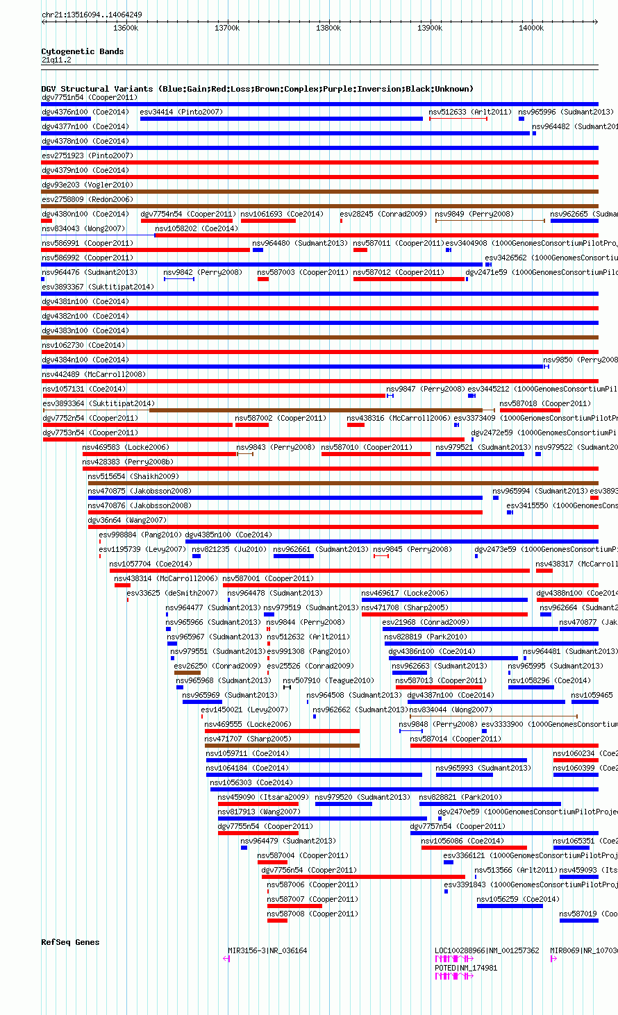 Variant DetailsVariant: nsv1067344| Internal ID | 19156563 | | Landmark | | | Location Information | | | Cytoband | 21q11.2 | | Allele length | | Assembly | Allele length | | hg38 | 548156 | | hg19 | 548156 | | hg18 | 548156 |