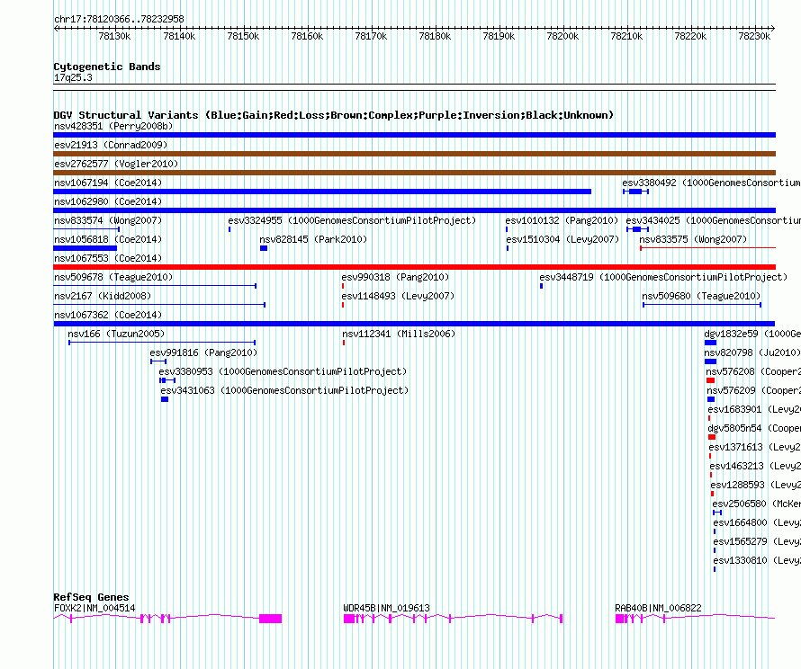 Variant DetailsVariant: nsv1067362| Internal ID | 19156581 | | Landmark | | | Location Information | | | Cytoband | 17q25.3 | | Allele length | | Assembly | Allele length | | hg38 | 112593 | | hg19 | 112593 | | hg18 | 112593 |