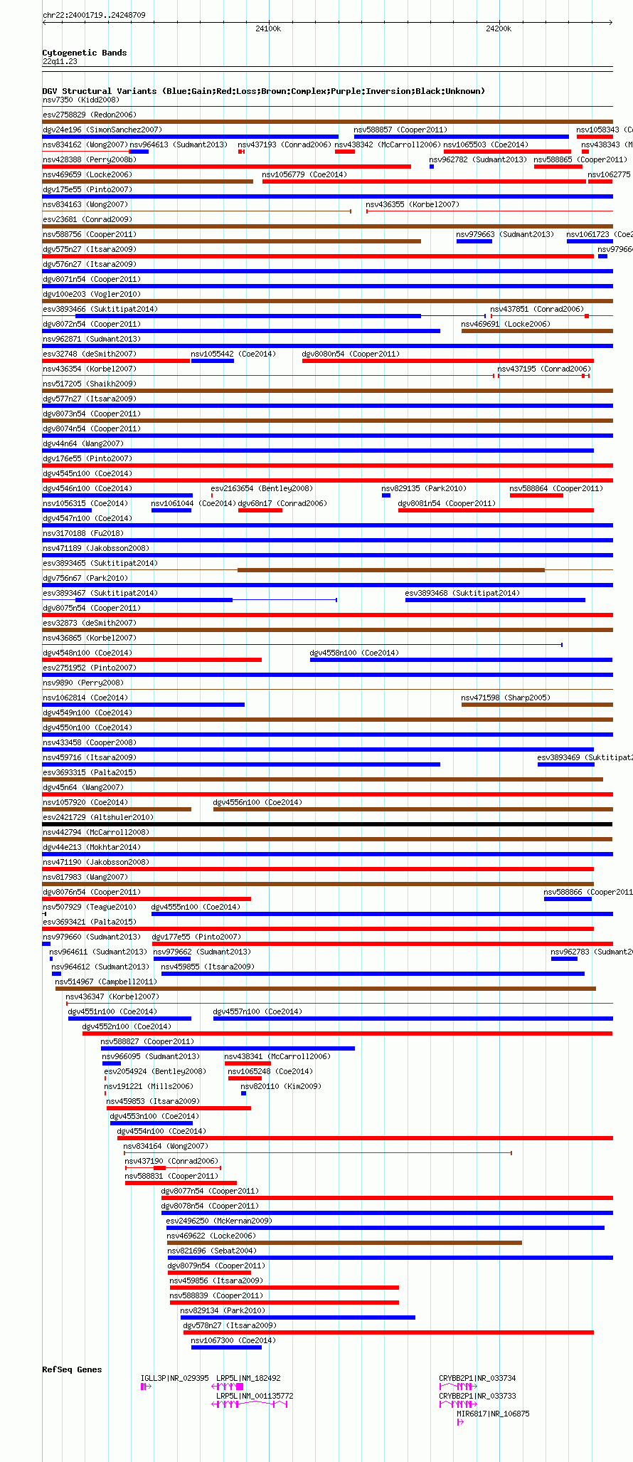 Variant DetailsVariant: nsv1067385| Internal ID | 19156604 | | Landmark | | | Location Information | | | Cytoband | 22q11.23 | | Allele length | | Assembly | Allele length | | hg38 | 246991 | | hg19 | 246991 | | hg18 | 246991 |