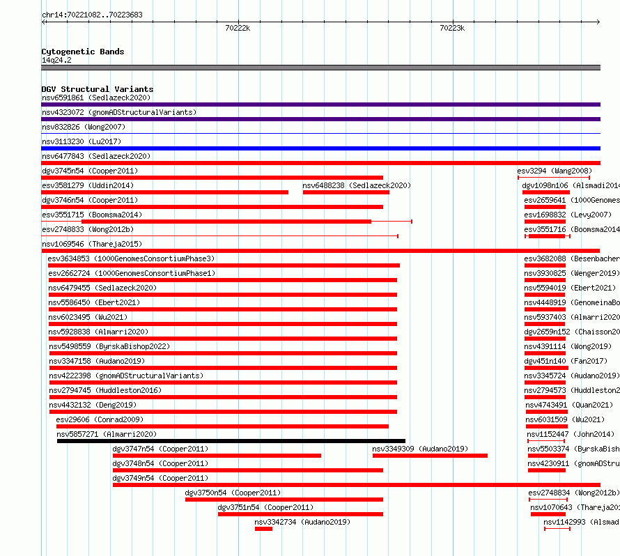 Variant DetailsVariant: nsv1069546| Internal ID | 19317961 | | Landmark | | | Location Information | | | Cytoband | 14q24.2 | | Allele length | | Assembly | Allele length | | hg38 | 2602 | | hg19 | 2602 |