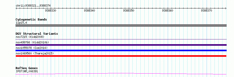 | Variant Type | CNV deletion | Copy Number | | Allele State | | Allele Origin | | Probe Count | | Validation Flag | | Merged Status | M | Merged Variants | | Supporting Variants | nssv3770150 | Samples | KWP1 | Known Genes | IPO7 | Method | Sequencing | Analysis | HugeSeq | Platform | Illumina HiSeq 2000 | Comments | | Reference | Thareja_et_al_2015 | Pubmed ID | 25765185 | Accession Number(s) | nsv1069560