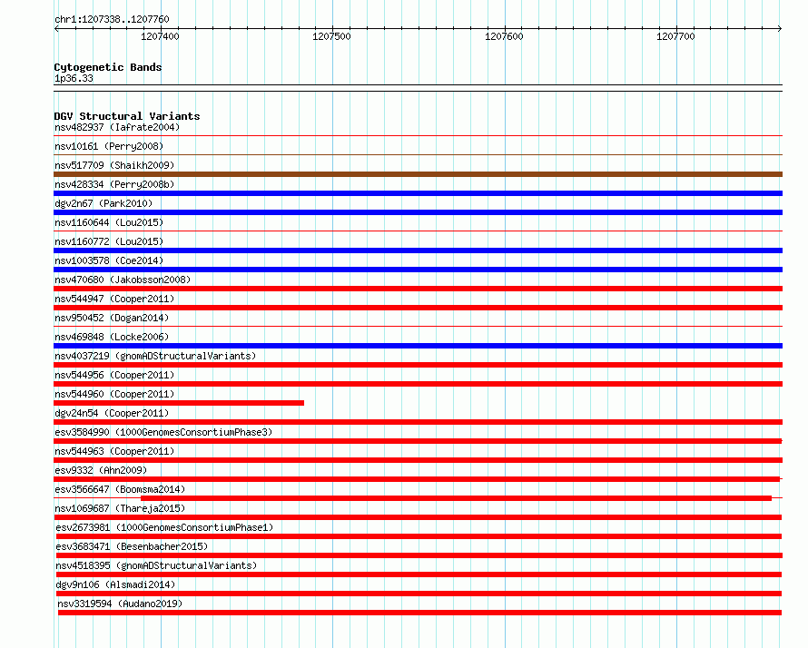 Variant DetailsVariant: nsv1069687| Internal ID | 18978944 | | Landmark | | | Location Information | | | Cytoband | 1p36.33 | | Allele length | | Assembly | Allele length | | hg38 | 423 | | hg19 | 423 |