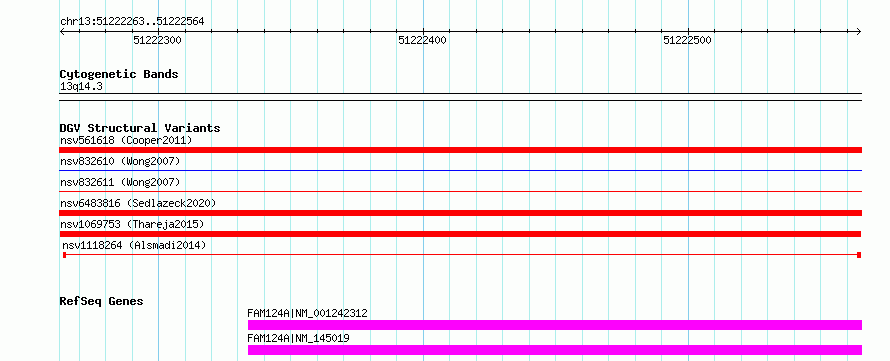 Variant DetailsVariant: nsv1069753| Internal ID | 19317951 | | Landmark | | | Location Information | | | Cytoband | 13q14.3 | | Allele length | | Assembly | Allele length | | hg38 | 302 | | hg19 | 302 |