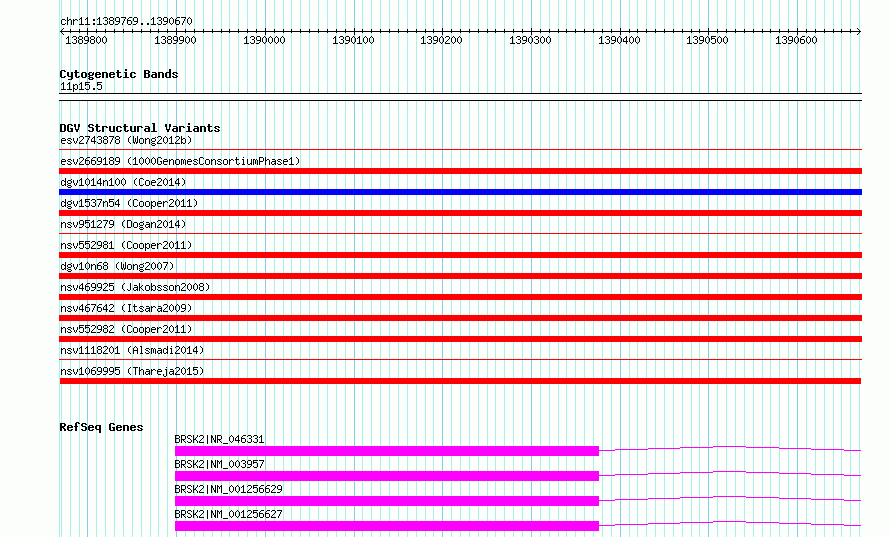 | Variant Type | CNV deletion | Copy Number | | Allele State | | Allele Origin | | Probe Count | | Validation Flag | | Merged Status | M | Merged Variants | | Supporting Variants | nssv3770823 | Samples | KWP1 | Known Genes | BRSK2 | Method | Sequencing | Analysis | HugeSeq | Platform | Illumina HiSeq 2000 | Comments | | Reference | Thareja_et_al_2015 | Pubmed ID | 25765185 | Accession Number(s) | nsv1069995