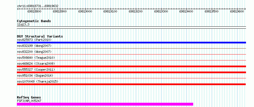 | | Variant Type | CNV deletion | | Copy Number | | | Allele State | | | Allele Origin | | | Probe Count | | | Validation Flag | | | Merged Status | M | | Merged Variants | | | Supporting Variants | nssv3772954 | | Samples | KWP1 | | Known Genes | FGF3 | | Method | Sequencing | | Analysis | HugeSeq | | Platform | Illumina HiSeq 2000 | | Comments | | | Reference | Thareja_et_al_2015 | | Pubmed ID | 25765185 | | Accession Number(s) | nsv1070049