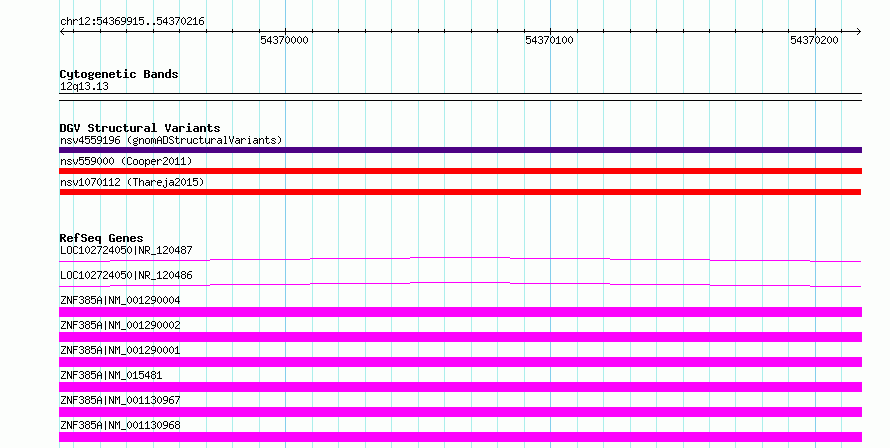 Variant DetailsVariant: nsv1070112| Internal ID | 19319443 | | Landmark | | | Location Information | | | Cytoband | 12q13.13 | | Allele length | | Assembly | Allele length | | hg38 | 302 | | hg19 | 302 |