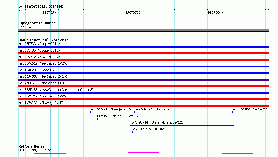 Variant DetailsVariant: nsv1070235| Internal ID | 19320253 | | Landmark | | | Location Information | | | Cytoband | 14q32.2 | | Allele length | | Assembly | Allele length | | hg38 | 302 | | hg19 | 302 |