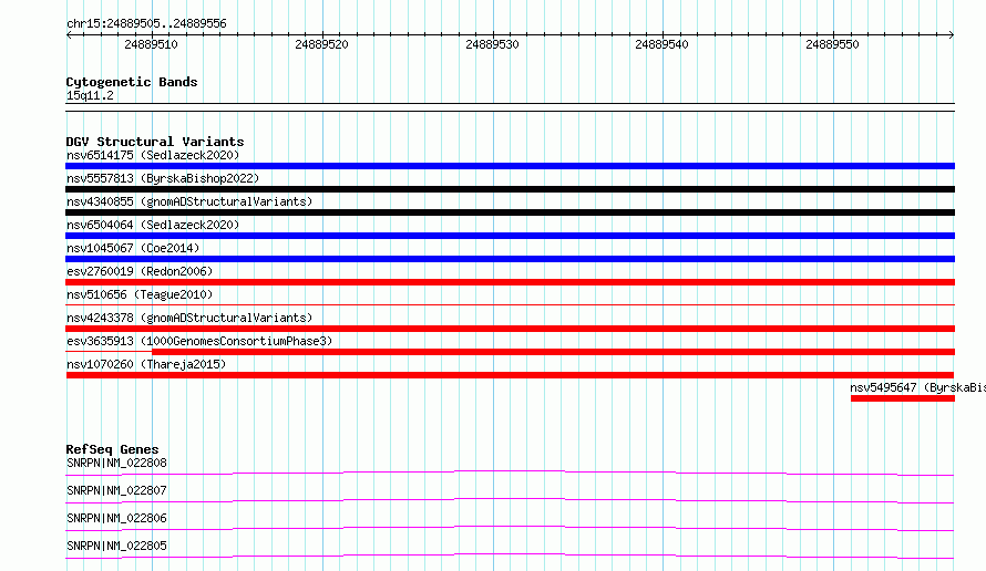 Variant DetailsVariant: nsv1070260| Internal ID | 19322615 | | Landmark | | | Location Information | | | Cytoband | 15q11.2 | | Allele length | | Assembly | Allele length | | hg38 | 52 | | hg19 | 52 |