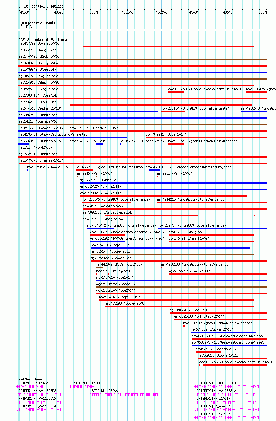 Variant DetailsVariant: nsv1070270| Internal ID | 18970951 | | Landmark | | | Location Information | | | Cytoband | 15q15.3 | | Allele length | | Assembly | Allele length | | hg38 | 73402 | | hg19 | 73402 |