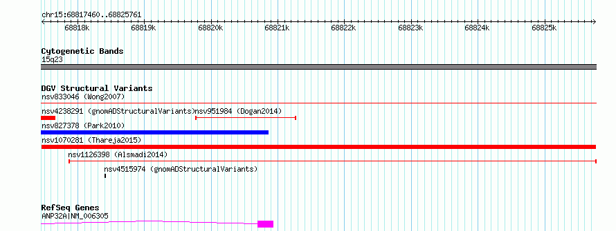 Variant DetailsVariant: nsv1070281| Internal ID | 18972483 | | Landmark | | | Location Information | | | Cytoband | 15q23 | | Allele length | | Assembly | Allele length | | hg38 | 8302 | | hg19 | 8302 |