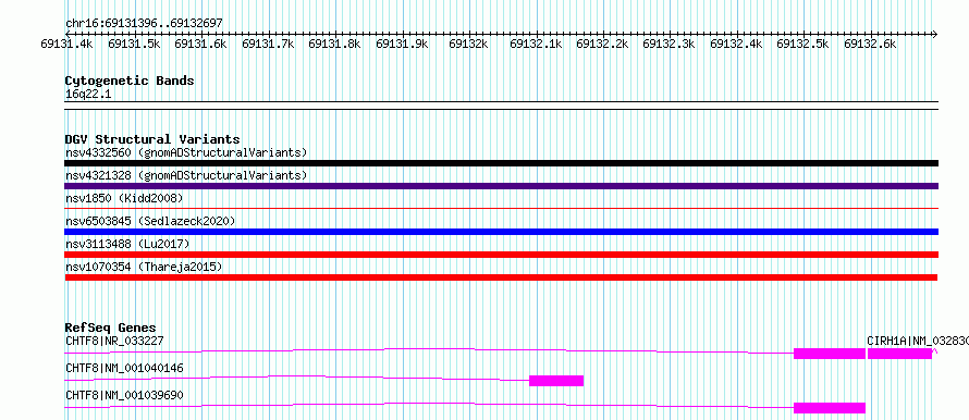 Variant DetailsVariant: nsv1070354| Internal ID | 19323294 | | Landmark | | | Location Information | | | Cytoband | 16q22.1 | | Allele length | | Assembly | Allele length | | hg38 | 1302 | | hg19 | 1302 |