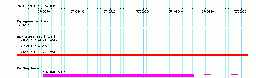 Variant DetailsVariant: nsv1070533| Internal ID | 18975446 | | Landmark | | | Location Information | | | Cytoband | 12q13.3 | | Allele length | | Assembly | Allele length | | hg38 | 702 | | hg19 | 702 |