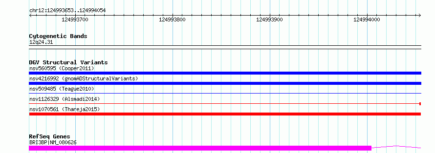 | Variant Type | CNV deletion | Copy Number | | Allele State | | Allele Origin | | Probe Count | | Validation Flag | | Merged Status | M | Merged Variants | | Supporting Variants | nssv3772521 | Samples | KWP1 | Known Genes | BRI3BP | Method | Sequencing | Analysis | HugeSeq | Platform | Illumina HiSeq 2000 | Comments | | Reference | Thareja_et_al_2015 | Pubmed ID | 25765185 | Accession Number(s) | nsv1070561
