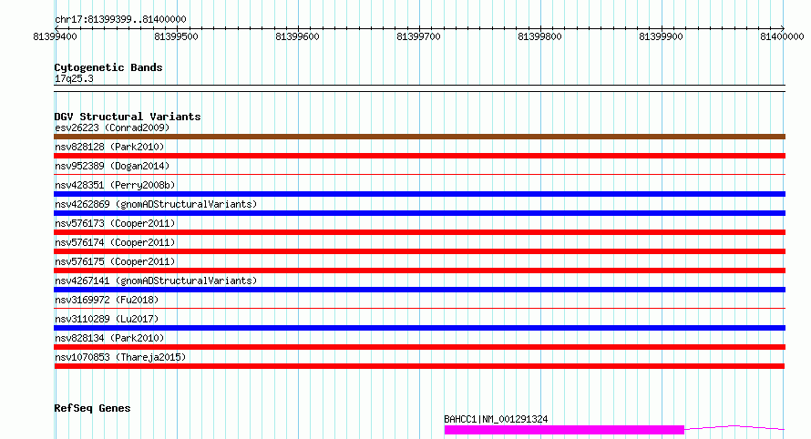 Variant DetailsVariant: nsv1070853| Internal ID | 19325647 | | Landmark | | | Location Information | | | Cytoband | 17q25.3 | | Allele length | | Assembly | Allele length | | hg38 | 602 | | hg19 | 602 |