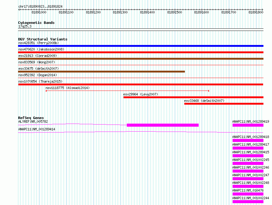 | | Variant Type | CNV deletion | | Copy Number | | | Allele State | | | Allele Origin | | | Probe Count | | | Validation Flag | | | Merged Status | M | | Merged Variants | | | Supporting Variants | nssv3771055 | | Samples | KWP1 | | Known Genes | ALYREF, ANAPC11 | | Method | Sequencing | | Analysis | HugeSeq | | Platform | Illumina HiSeq 2000 | | Comments | | | Reference | Thareja_et_al_2015 | | Pubmed ID | 25765185 | | Accession Number(s) | nsv1070854