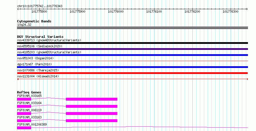 | | Variant Type | CNV deletion | | Copy Number | | | Allele State | | | Allele Origin | | | Probe Count | | | Validation Flag | | | Merged Status | M | | Merged Variants | | | Supporting Variants | nssv3762582 | | Samples | KWP1 | | Known Genes | FGF8 | | Method | Sequencing | | Analysis | HugeSeq | | Platform | Illumina HiSeq 2000 | | Comments | | | Reference | Thareja_et_al_2015 | | Pubmed ID | 25765185 | | Accession Number(s) | nsv1070886