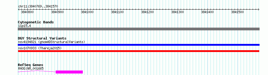 | Variant Type | CNV deletion | Copy Number | | Allele State | | Allele Origin | | Probe Count | | Validation Flag | | Merged Status | M | Merged Variants | | Supporting Variants | nssv3765872 | Samples | KWP1 | Known Genes | RHOG | Method | Sequencing | Analysis | HugeSeq | Platform | Illumina HiSeq 2000 | Comments | | Reference | Thareja_et_al_2015 | Pubmed ID | 25765185 | Accession Number(s) | nsv1070933