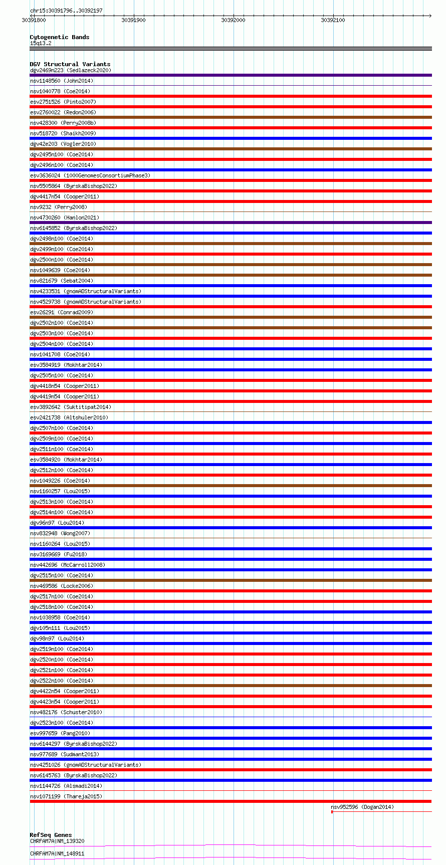 Variant DetailsVariant: nsv1071199| Internal ID | 19317048 | | Landmark | | | Location Information | | | Cytoband | 15q13.2 | | Allele length | | Assembly | Allele length | | hg38 | 402 | | hg19 | 402 |