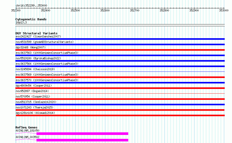 Variant DetailsVariant: nsv1071243| Internal ID | 19324691 | | Landmark | | | Location Information | | | Cytoband | 16p13.3 | | Allele length | | Assembly | Allele length | | hg38 | 702 | | hg19 | 702 |