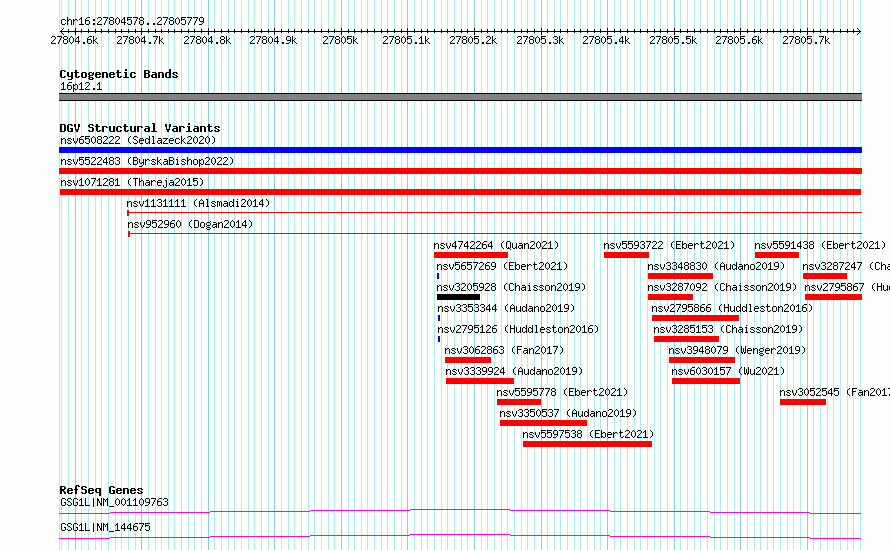 Variant DetailsVariant: nsv1071281| Internal ID | 19326298 | | Landmark | | | Location Information | | | Cytoband | 16p12.1 | | Allele length | | Assembly | Allele length | | hg38 | 1202 | | hg19 | 1202 |