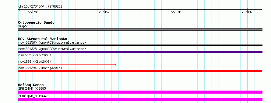 | Variant Type | CNV deletion | Copy Number | | Allele State | | Allele Origin | | Probe Count | | Validation Flag | | Merged Status | M | Merged Variants | | Supporting Variants | nssv3764174 | Samples | KWP1 | Known Genes | ZFHX3 | Method | Sequencing | Analysis | HugeSeq | Platform | Illumina HiSeq 2000 | Comments | | Reference | Thareja_et_al_2015 | Pubmed ID | 25765185 | Accession Number(s) | nsv1071294