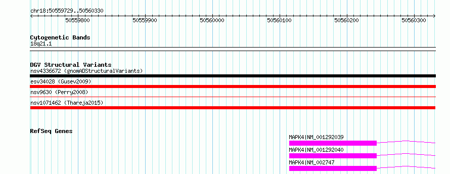 | Variant Type | CNV deletion | Copy Number | | Allele State | | Allele Origin | | Probe Count | | Validation Flag | | Merged Status | M | Merged Variants | | Supporting Variants | nssv3762055 | Samples | KWP1 | Known Genes | MAPK4 | Method | Sequencing | Analysis | HugeSeq | Platform | Illumina HiSeq 2000 | Comments | | Reference | Thareja_et_al_2015 | Pubmed ID | 25765185 | Accession Number(s) | nsv1071462