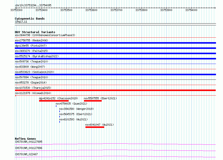 Variant DetailsVariant: nsv1071530| Internal ID | 19325788 | | Landmark | | | Location Information | | | Cytoband | 19q13.11 | | Allele length | | Assembly | Allele length | | hg38 | 802 | | hg19 | 802 |