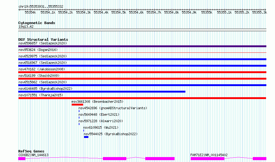 Variant DetailsVariant: nsv1071551| Internal ID | 19318901 | | Landmark | | | Location Information | | | Cytoband | 19q13.42 | | Allele length | | Assembly | Allele length | | hg38 | 1402 | | hg19 | 1402 |