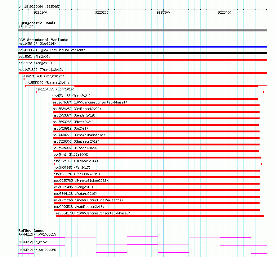 Variant DetailsVariant: nsv1071829| Internal ID | 19318751 | | Landmark | | | Location Information | | | Cytoband | 18p11.22 | | Allele length | | Assembly | Allele length | | hg38 | 404 | | hg19 | 404 |