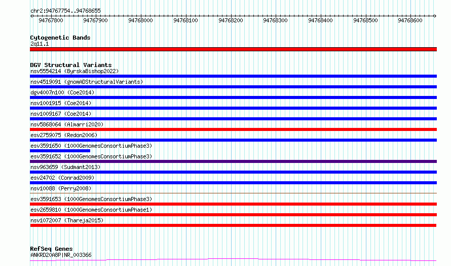 Variant DetailsVariant: nsv1072007| Internal ID | 19321721 | | Landmark | | | Location Information | | | Cytoband | 2q11.1 | | Allele length | | Assembly | Allele length | | hg38 | 902 | | hg19 | 902 |