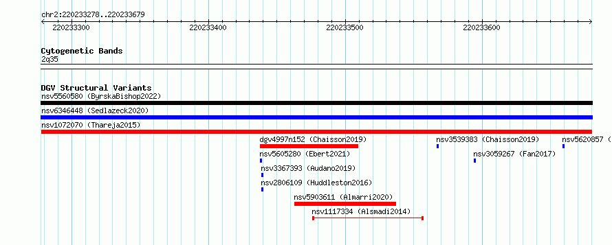 Variant DetailsVariant: nsv1072070| Internal ID | 19316149 | | Landmark | | | Location Information | | | Cytoband | 2q35 | | Allele length | | Assembly | Allele length | | hg38 | 402 | | hg19 | 402 |