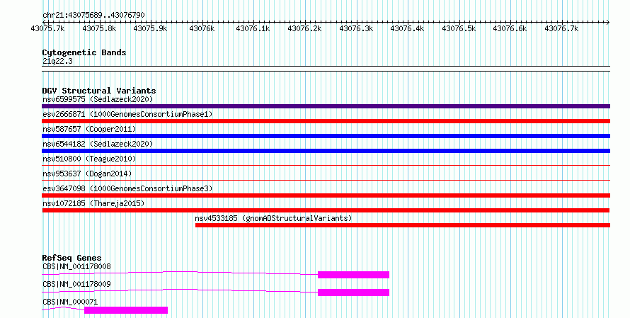 Variant DetailsVariant: nsv1072185| Internal ID | 19320190 | | Landmark | | | Location Information | | | Cytoband | 21q22.3 | | Allele length | | Assembly | Allele length | | hg38 | 1102 | | hg19 | 1102 |