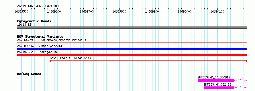 Variant DetailsVariant: nsv1072329| Internal ID | 18970124 | | Landmark | | | Location Information | | | Cytoband | 19p13.12 | | Allele length | | Assembly | Allele length | | hg38 | 702 | | hg19 | 702 |