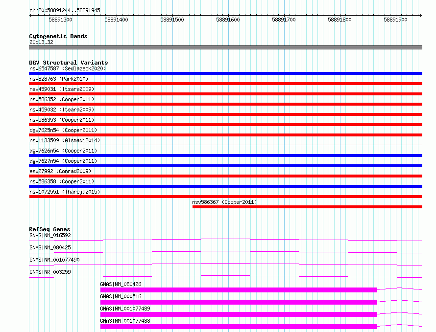 Variant DetailsVariant: nsv1072551| Internal ID | 19317773 | | Landmark | | | Location Information | | | Cytoband | 20q13.32 | | Allele length | | Assembly | Allele length | | hg38 | 702 | | hg19 | 702 |