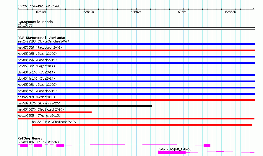 Variant DetailsVariant: nsv1072554| Internal ID | 19320810 | | Landmark | | | Location Information | | | Cytoband | 20q13.33 | | Allele length | | Assembly | Allele length | | hg38 | 5002 | | hg19 | 5002 |