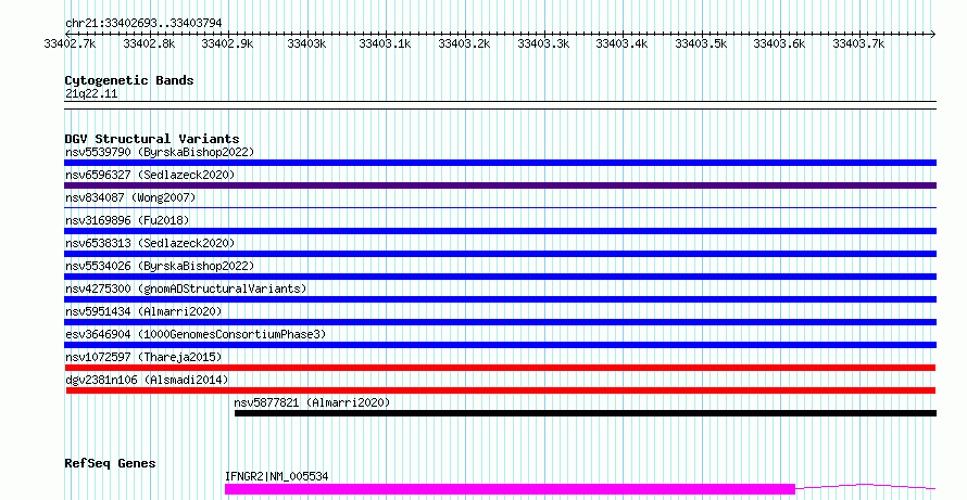 Variant DetailsVariant: nsv1072597| Internal ID | 19325673 | | Landmark | | | Location Information | | | Cytoband | 21q22.11 | | Allele length | | Assembly | Allele length | | hg38 | 1102 | | hg19 | 1102 |